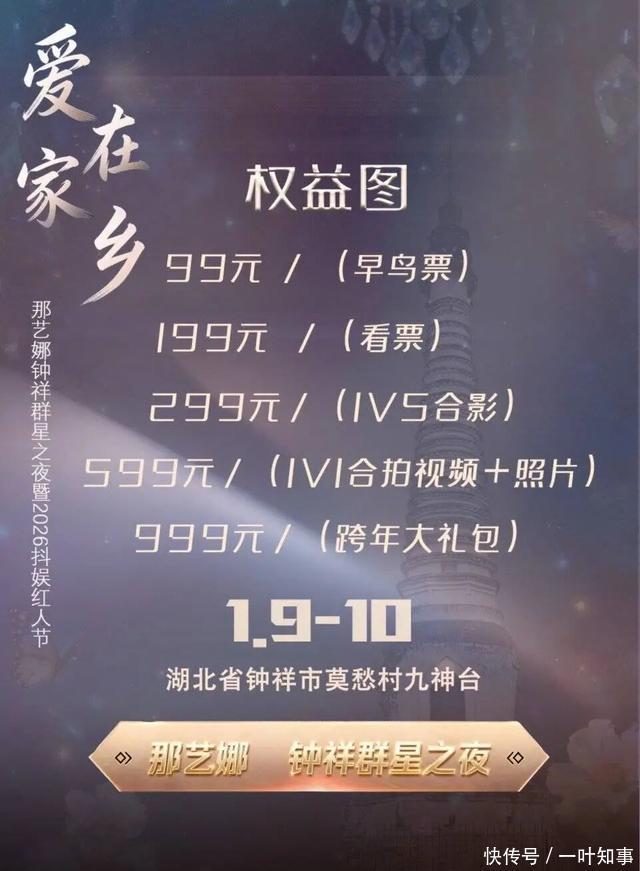 宣传海报显示,这场名为“爱在家乡·那艺娜钟祥群星之夜暨2026抖娱红人节”的晚会,将于2026年1月9日至1月10日晚,在钟祥莫愁村景区上演。 晚会由当地网红那艺娜领衔,曲艺演员侯耀华、歌手东来东往、旭日阳刚组合的王旭、音乐人东方骏等人为主要演员。 另外,还有“嘎子”谢孟伟等一系列人员担任贺喜嘉宾。 相关票务平台显示,这场晚会对外销售看票、合影票、一对一合拍视频等项目, 最高价格999元,最低99元。