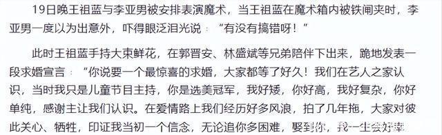 求婚显创意,十年婚姻路不易 回溯王祖蓝和李亚男的爱情故事,浪漫的画面仿佛就在眼前。 2014年,在TVB台庆这个万众瞩目的场合,王祖蓝别出心裁地策划了一场"假装魔术意外"的求婚。
